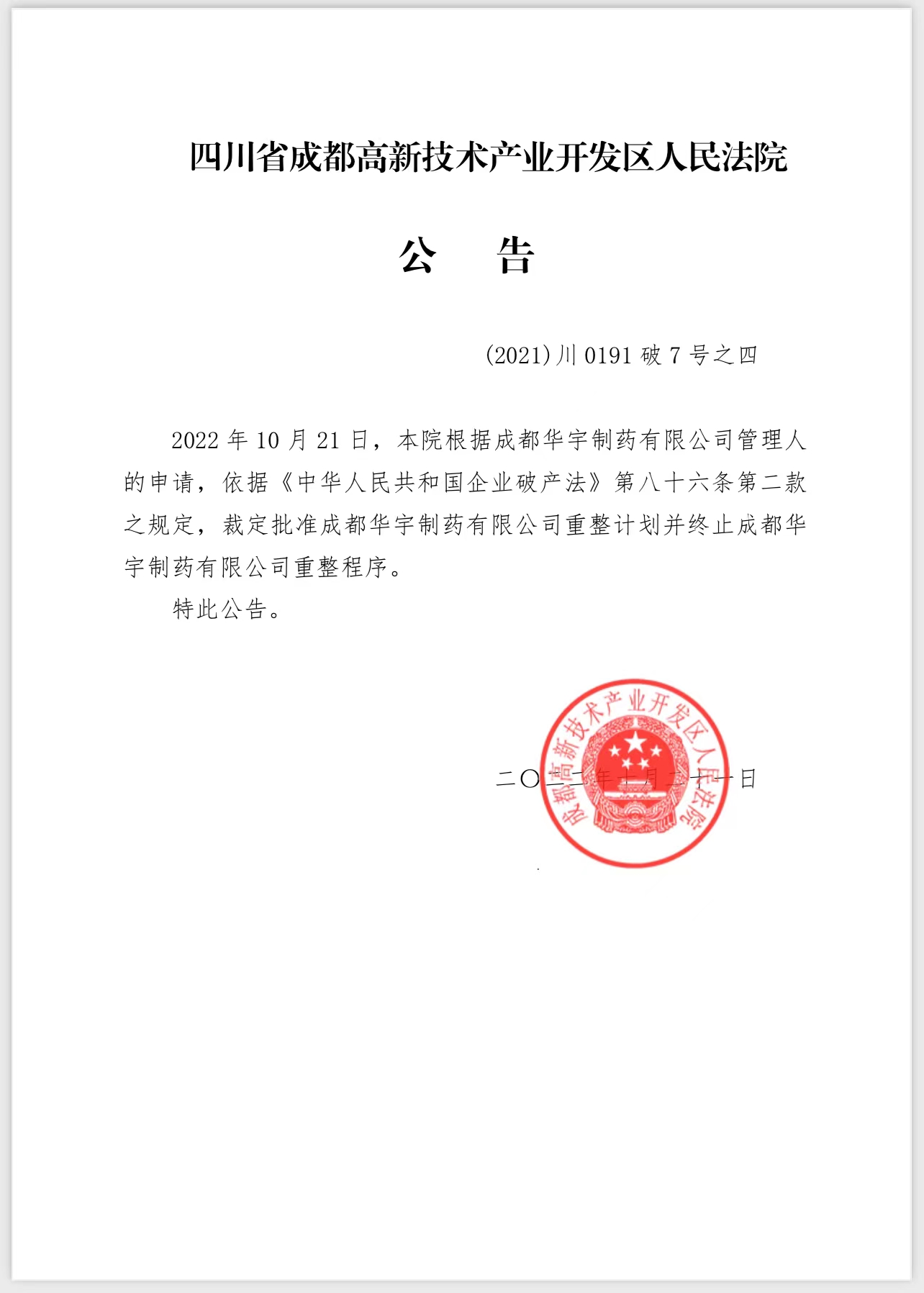 關于裁定批準成都華宇制藥有限公司重整計劃之公告